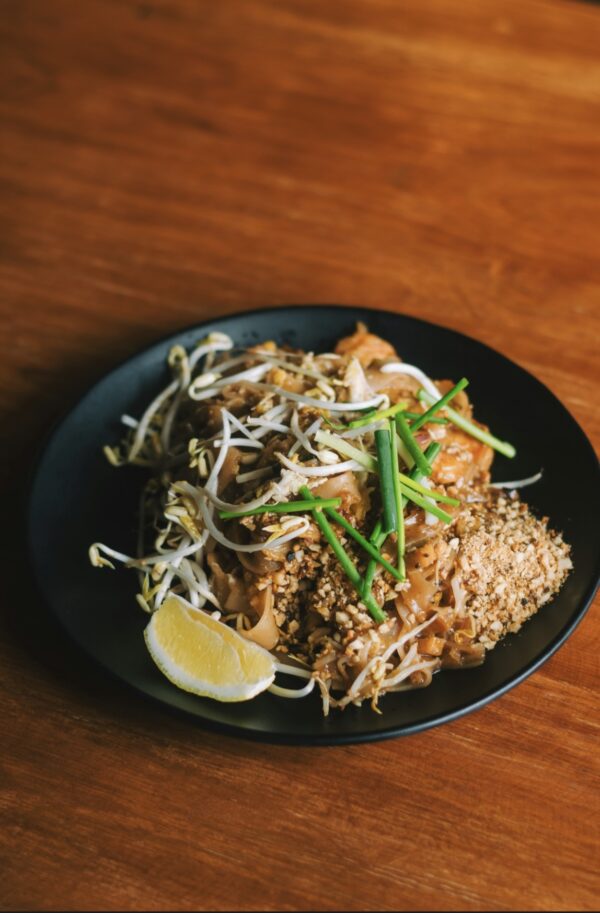 Mix warzyw, chrupiący kurczak w sosie kantońskim, podawany z czarnym ryżem jaśminowym