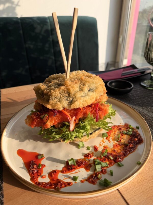 Burger deluxe z sosem aioli, warzywa marynowane, chrupiący i aromatyczny kurczak karage, crispy chilli